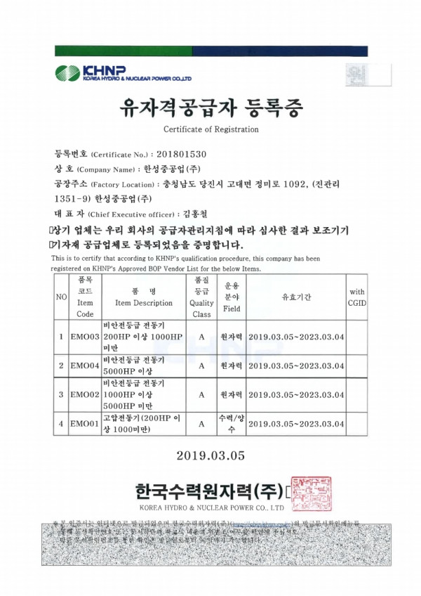 유자격공급자 등록증 한성중공업 업체 등록 인증서 0 108333 2020.01.28 13:58 1. EMO03 _ 비안전전등급 전동기 200HP 이상 1000HP 미만 _ A등급(원자력) 2. EMO04 _ 비안전전등급 전동기 5000HP 이상 _ A등급(원자력) 3. EMO02 _ 비안전전등급 전동기 1000HP 이상 5000HP 미만 _ A등급(원자력) 4. EMO01 _ 고압전동기(200HP 이상 1000미만) _ A등급(수력/양수)