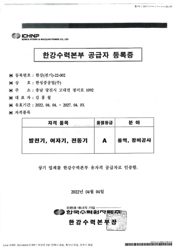 한강수력본부 공급자 등록증