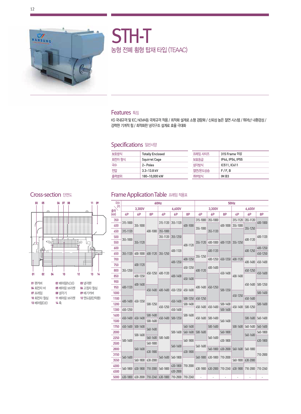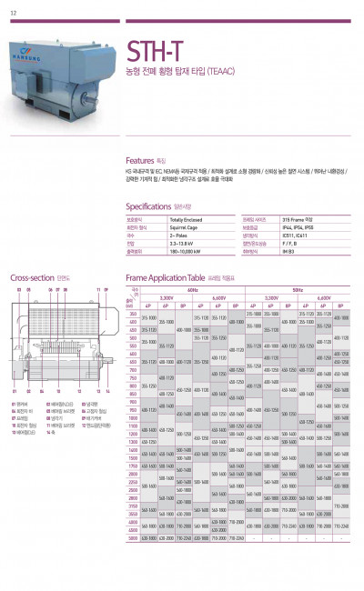 KS 국내규격 및 IEC, NEMA등 국제규격 적용 / 최적화 설계로 소형 경량화 / 신뢰성 높은 절연 시스템 / 뛰어난 내환경성 / 강력한 기계적 힘 / 최적화한 냉각구조 설계로 효율 극대화