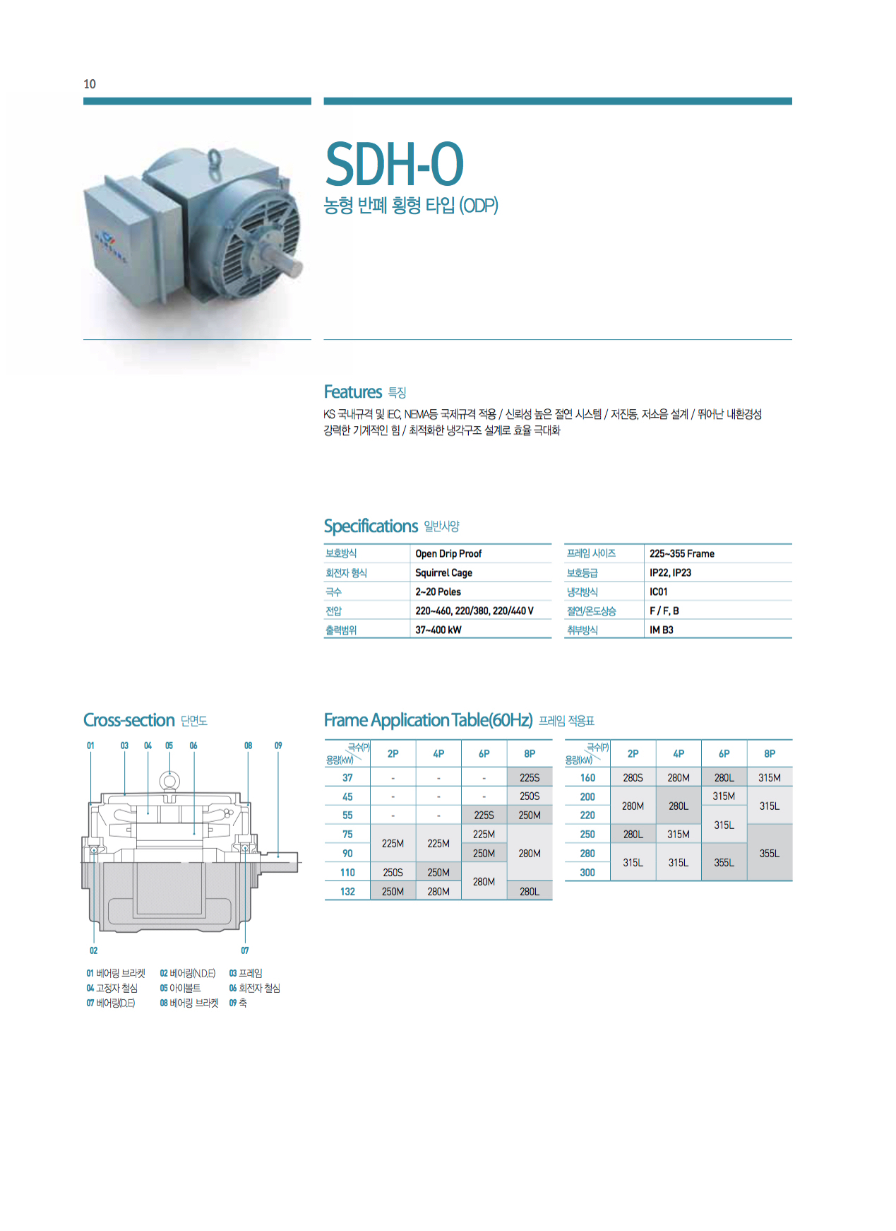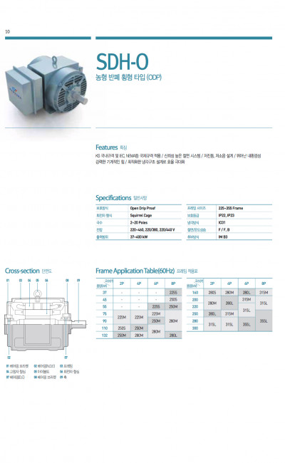 KS 국내규격 및 IEC, NEMA등 국제규격 적용 / 신뢰성 높은 절연 시스템 / 저진동, 저소음 설계 / 뛰어난 내환경성 강력한 기계적인 힘 / 최적화한 냉각구조 설계로 효율 극대화