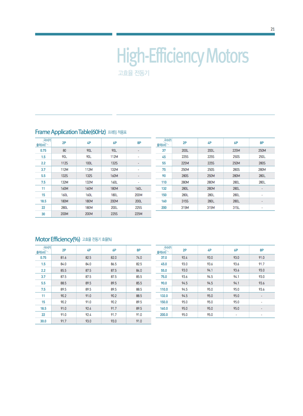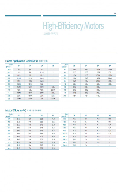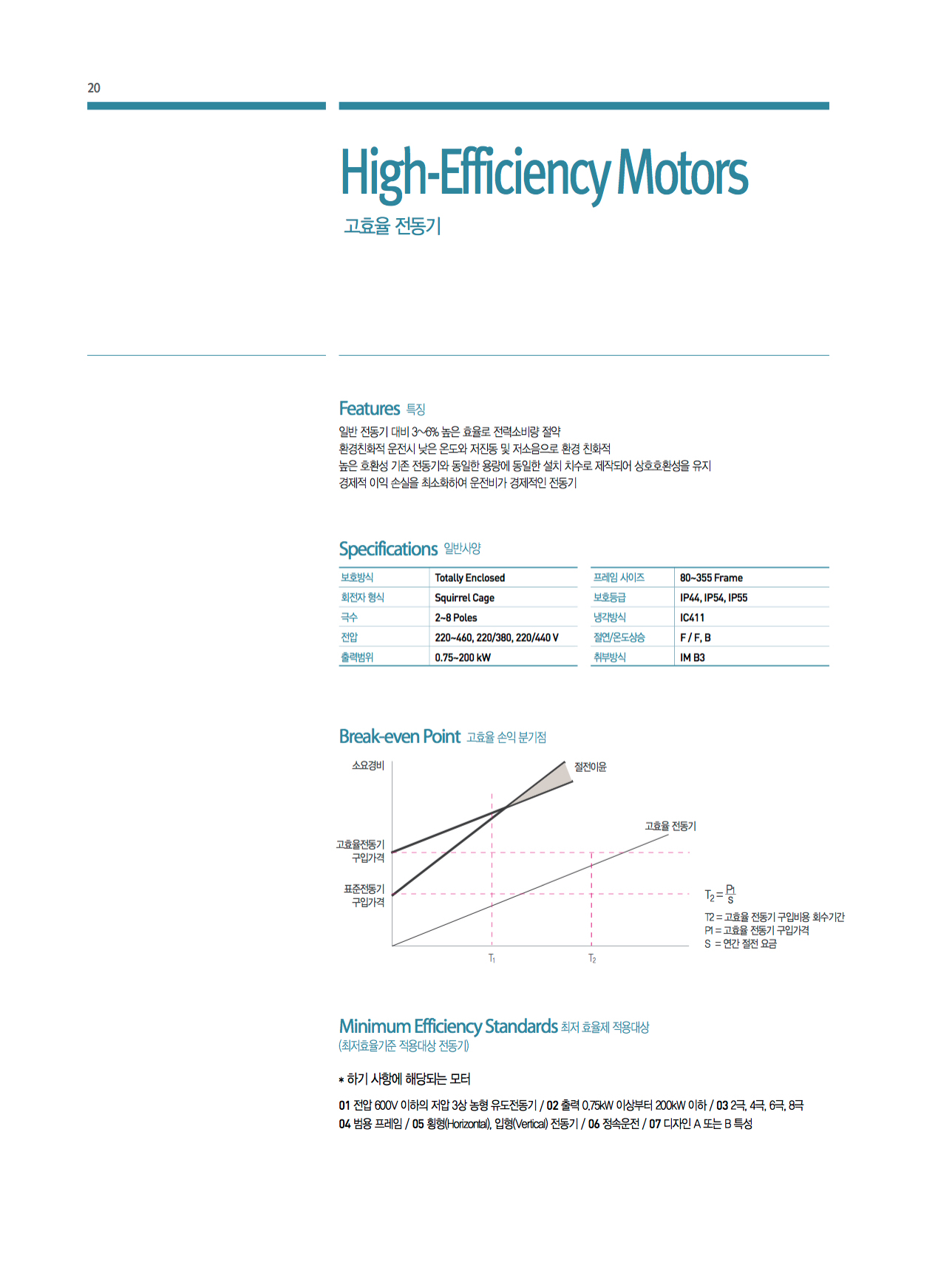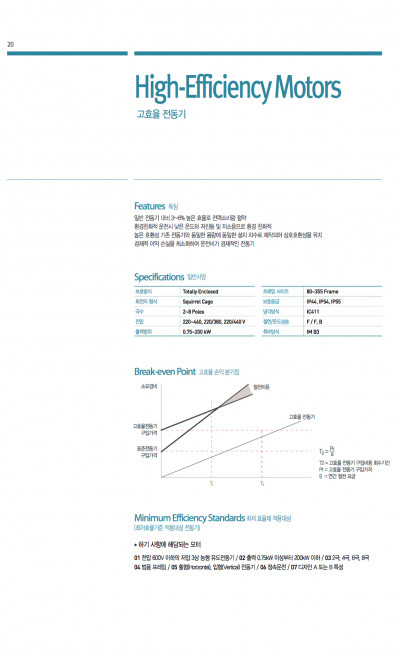 일반 전동기 대비 3~6% 높은 효율로 전력소비량 절약 환경친화적 운전시 낮은 온도와 저진동 및 저소음으로 환경 친화적 높은 호환성 기존 전동기와 동일한 용량에 동일한 설치 치수로 제작되어 상호호환성을 유지 경제적 이익 손실을 최소화하여 운전비가 경제적인 전동기